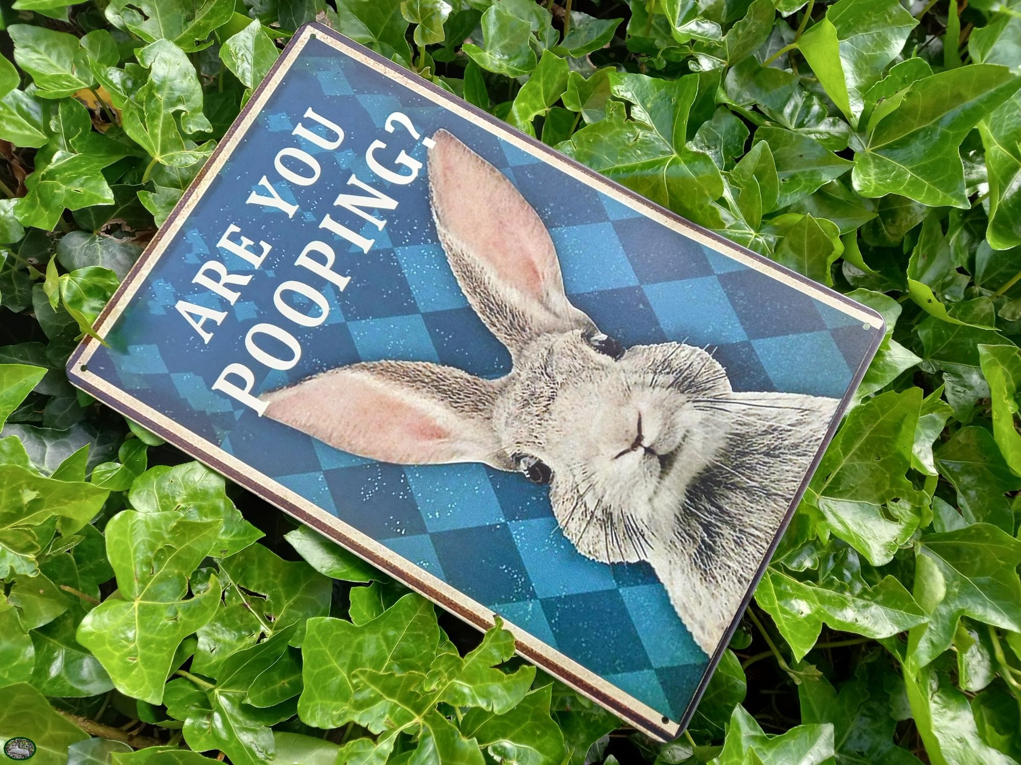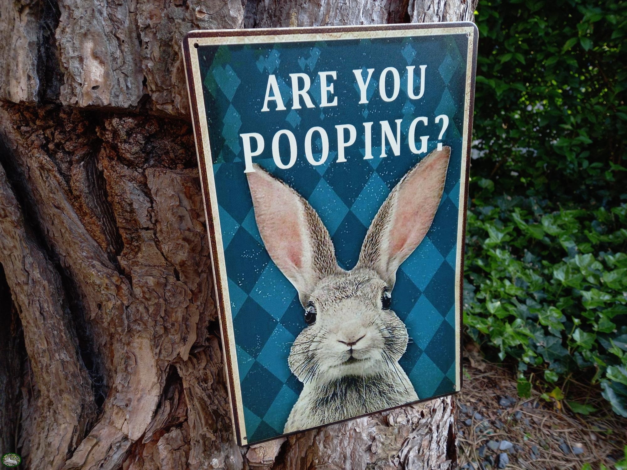 Waakbord "Are you Pooping" Metaal Een aanwinst voor elk interieur van een konijnenliefhebber zijn of haar huis is het Waakbord "Are you pooping" Metaal. Afmetingen zijn als volgt: 30x20x1cm Te bevestigen met schroeven, bevat voorgeboorde gaatjes.