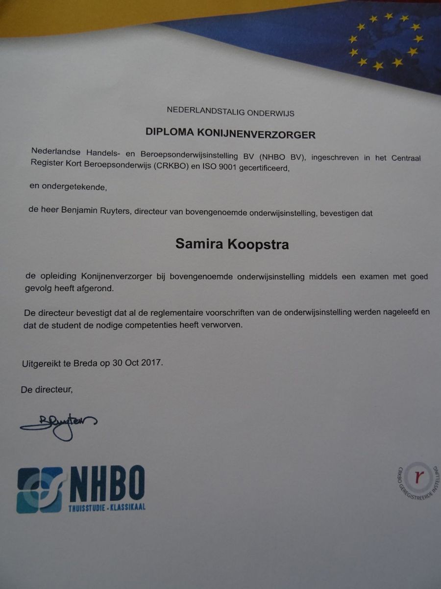 Inmiddels zijn de onderstaande opleidingen afgerond en is "Konijnen Verzorger" omgezet tot "Konijnen Verzorger Adviesbureau" en is