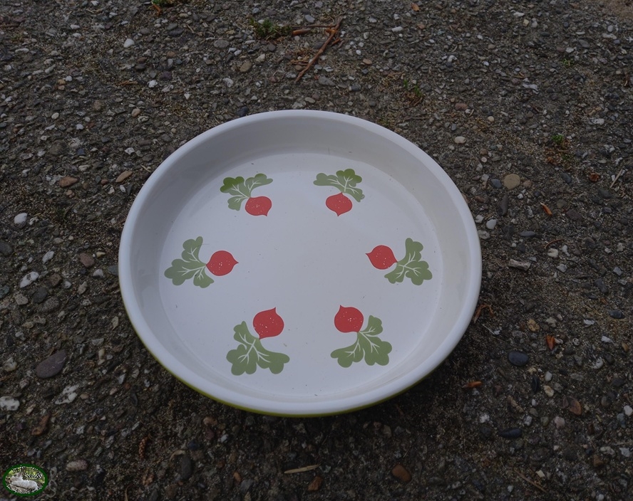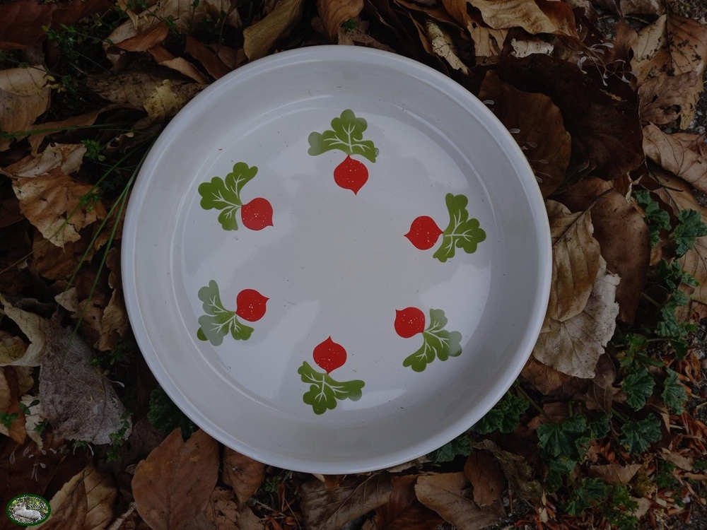 Op de voerschaal staan afbeeldingen van radijsjes.